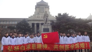 寒风凛冽,怀揣着对白求恩伟大医德精神的崇敬之情,同学们准时聚集到白求恩雕像前。党员们身穿洁白的医护服组成宣誓方阵,宣誓活动正式开始。在优秀党员代表的领誓下,现场响起了整齐、激昂的宣誓声,每位同学都在用发自内心的声音抒发着对“弘扬白求恩精神、献身医学事业”的决心。庄严的宣誓词也道出了所有党员们的心声,他们表示会恪守自己在白求恩像前的诺言,严格要求自己,时刻保持共产党员的先进性,努力使自己成为一名优秀共产党员。