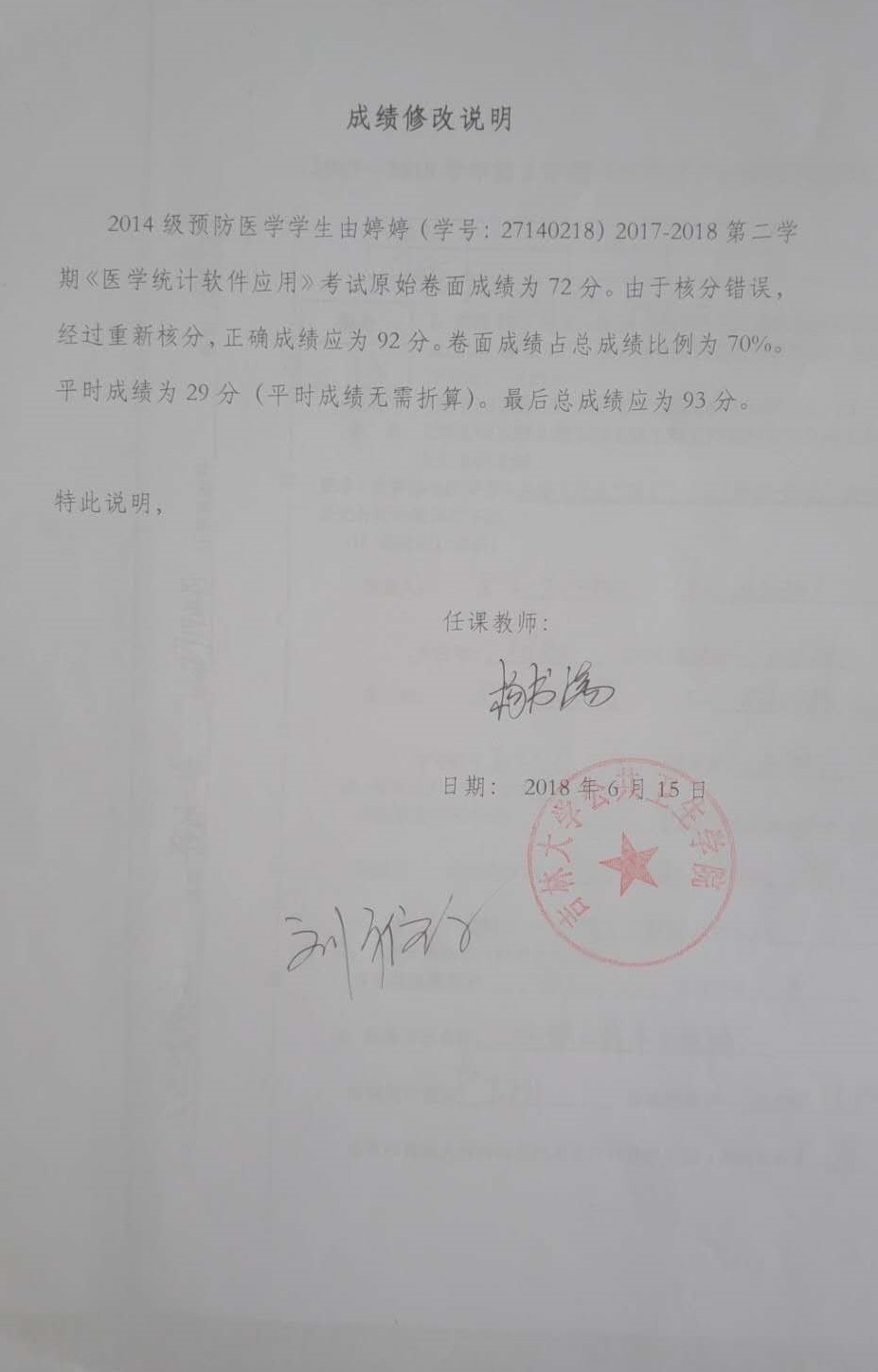 根据《关于进一步明确本科生课程考核等有关问题的通知》(校教字〔2018〕47号)文件有关精神,现对beet365公司2014级由婷婷同学(27140218)2017-2018-2《医学统计软件应用》成绩更正如下: