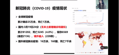 3月21日上午,在国内新冠疫情防控工作取得阶段性胜利,高校复学复课前夕,beet365联合行政公司,举办“护航复学复课,守卫健康安全——新冠疫情防控知识讲座”,组织两个公司全体教职工、研究生和本科生2200余人共上一堂课。讲座通过“钉钉”网络视频直播的形式进行,由beet365流行病学与卫生统计学教研室甄清副教授主讲,参加讲座的师生分布在祖国各地。
