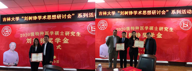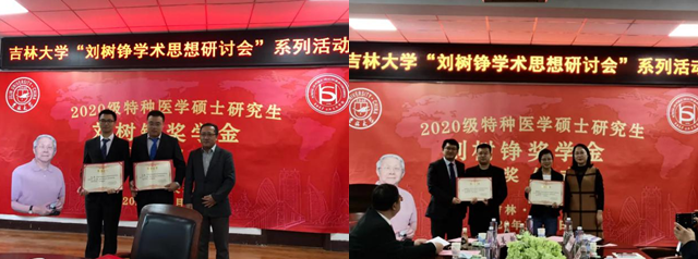 大会首先进行了刘树铮基金研究生奖学金的颁奖仪式,刘意教授宣读了2020级特种医学硕士研究生“刘树铮研究生奖学金”获奖名单,赵国利书记为一等奖学金获得者颁发了获奖证书;苏旭教授及赵勇教授为二等奖学金获得者颁发了获奖证书;金光辉教授为三等奖学金获得者颁发了获奖证书;姜新教授和金顺子教授为优秀奖获得者颁发了获奖证书。王铭蔚作为获奖研究生代表表示珍惜这份荣誉,在未来的学习和生活中发扬刘树铮老前辈刻苦钻研、严谨求实、坚持不懈的精神,积极向上,严格律己。刘雅文经理、英国上市公司365白求恩医学部李滢宇副部长分别致辞。