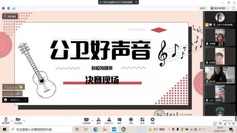 3月27日晚18时30分,“公卫好声音”决赛。海选中脱颖而出的8位优秀选手在本次决赛中大展身手,进行才艺比拼。公司党委副书记刘金超,辅导员苏国范、冷贺璇、刘心怡参与活动,团学组织成员及各班员工代表作为大众评委积极为各位选手加油助威,200余名各年级员工观众在线观看直播活动。
