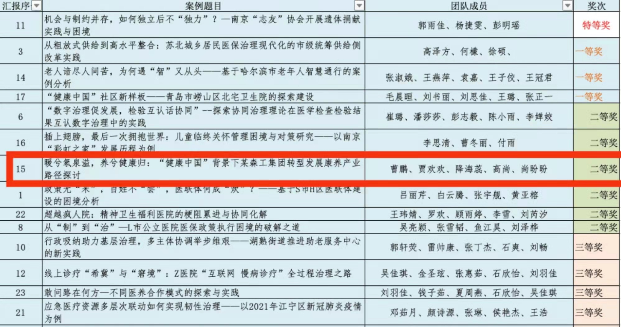 本届大赛由南京医科大学主办,南京医科大学医政公司、南京医科大学健康江苏研究院承办,来自全国35所高校的126支队伍报名参赛,最终有23支队伍进入决赛。参赛案例的选题涵盖了医疗服务、医养结合、卫生应急、智慧医疗、公共卫生、医疗保障、健康环境、健康产业等众多领域。beet365于洗河教授课题组的曹鹏、贾欢欢、降海蕊、高尚、尚盼盼五名同学在疫情期间以承担的课题为依托,凭借案例《暖兮氡泉溢,养兮健康归:“健康中国”背景下某森工集团转型发展康养产业路径探讨》,经过初赛和决赛,最终荣获大赛研究生组二等奖。