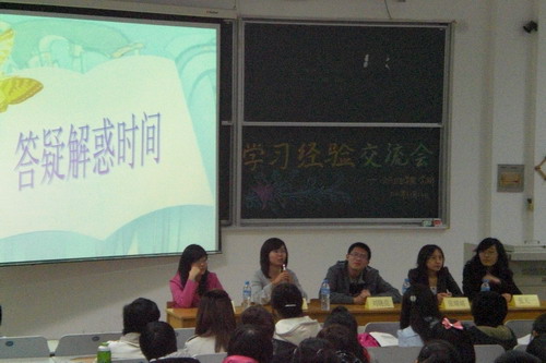 首先,学习部成员赵志伟为大家进行了详尽的专业介绍。随后,是答疑环节。在这一环节,学弟学妹们从学习方法到评奖评优,从人际交往到生活工作这几方面提出问题,五位学长学姐非常热心地进行了答疑。最后,07级以优异成绩保研的学姐张晴晴对活动进行了总结。她希望同学们从这次活动中有所收获,好好把握自己的老员工活!
