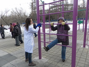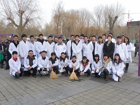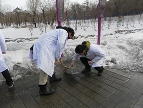 志愿者们身着代表着医员工身份的白大衣,手持扫把、簸箕和抹布等清洁用品在教学楼前集合后,徒步前往朝阳公园。寒冷的天气挡不住同学们“学雷锋”的热情,厚厚的积雪掩不住同学们志愿服务的干劲,大家自动分成几组,清扫健身区域内的积雪和垃圾,用抹布将健身器在上的污渍擦拭干净。经过一个多小时的紧张劳动,同学们成功完成了今天的工作。期间,正在锻炼的市民对同学们学习雷锋的行为赞不绝口,并表示将把这种学习雷锋的精神继续传递。