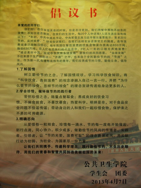 继动员会后,院员工会和团委共同发表了《厉行节约,从我做起》的倡议书,鼓励同学们践行“节约光荣,浪费可耻”的理念,肩负起当代老员工的青春使命,用实际行动为国家和社会尽一份力量!同时,公司利用校园广播、公司主页等阵地进行了广泛宣传。这一系列举措很快得到了师生的广泛响应。公司各年级陆续