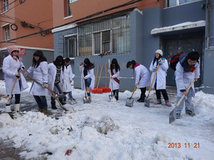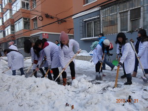 首先,由社区负责人带领志愿者们拿好铁铲、扫帚等铲雪扫雪工具,一起来到社区居民楼下,开始清扫活动。身着白大衣的beet365学子是寒风中一道暖心的亮丽风景。他们忙碌着,每个人都用尽全力破开坚冰,扫除积雪:部分路面由于汽车过往,积雪被压得非常厚实,但同学们不畏艰难,热情高涨,一点点地将其进行铲除清扫。活动最后,beet365与测绘与勘查工程系的志愿者们一起合影留念。