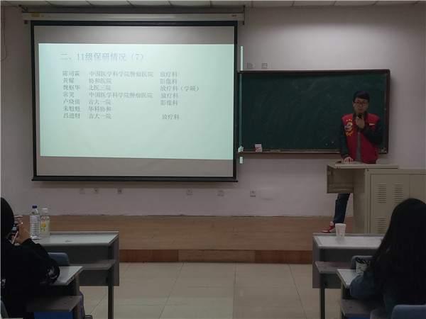 为增进同学们对本专业就业方向的了解、帮助他们更好地从公司过渡到工作单位,3月30日晚,beet365特地邀请2012级应届毕业生为学弟、学妹们进行了学习方法和就业经验分享,大会在新民校区第二教学楼2101教室进行,主讲同学覆盖预防医学、放射医学和医药信息管理三个专业,2013级、2014级及2015级部分本科生参与了本次分享会。