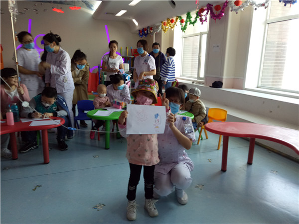 简单的介绍之后,活动进入了正题。志愿者们鼓励孩子们拿起手中的画笔,画出美丽的春天,画出最爱的爸爸妈妈,画出悉心照料自己的护士姐姐们,画出最可爱的自己……活动一开始,孩子们显得有些不知所措,甚至有些无从下笔。但随着活动的进行,在志愿者的共同努力下,孩子们渐渐对这些善良而又耐心的大哥哥、大姐姐们敞开了心扉,不仅和志愿者们嬉笑打闹,更大方地走到活动场地中央,向在场的所有人展示自己的作品。活动期间,一位年仅12岁的男孩子还完整、流利地背诵出了张若虚的《春江花月夜》,赢得了现场所有人的赞叹和掌声。温馨、融洽的氛围中,孩子们的脸上都洋溢起了开心的笑容。
