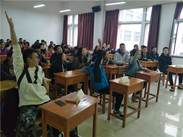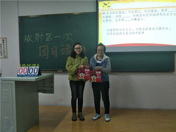活动开始时,同学们自愿分为四队,每队五人,以抢答的形式回答问题。比赛题目涵盖了党史,党章以及十九大传达的精神,使选手与观众们更系统全面的了解了中国共产党的奋斗历程,深刻认识到我国主要社会矛盾的转变,并真切感受到习近平总书记对创新产业,医疗事业与教育事业的深切关注和对广大青年们的殷切希望。接着,活动进入到你画我猜环节,意想不到的出题使观众们眼前一亮,选手们大呼过瘾。紧接着是抢凳子环节。所有环节结束后,主持人再次向大家传达了十九大精神。