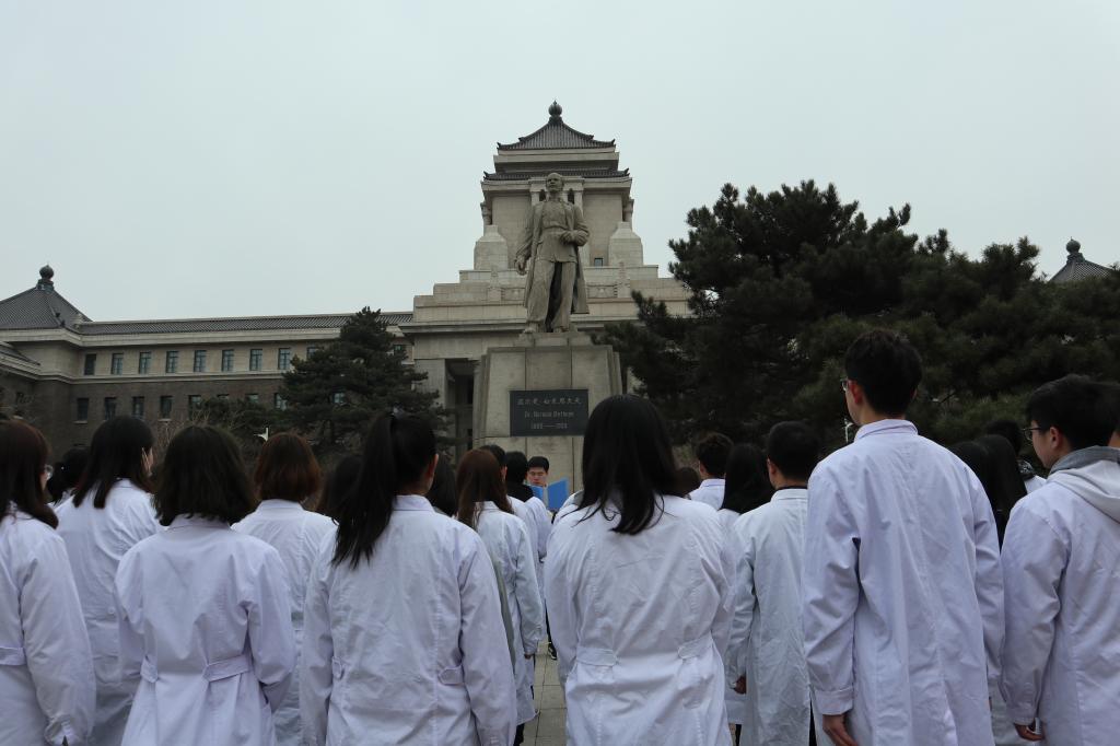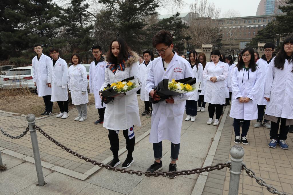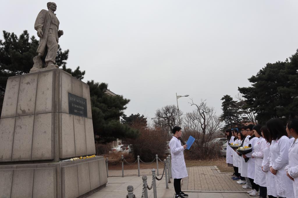 上午10时,员工代表们准时在白求恩雕像前集合。同学们身着白大褂,整齐地站成几排,虔诚地等待活动的开始。首先,由员工代表进行发言,引领同学们重温了诺尔曼·白求恩医生的感人事迹,深切表达了对白求恩同志的崇敬与追思,并鼓舞同学们要学习白求恩同志“毫不利己,专门利人”的革命精神,继承和发扬“白求恩精神”。每一位参与者都认真聆听了发言,在心中坚定了向白求恩医生学习的良好习惯。随后,员工代表们怀着崇敬的心情清洁了雕像附近的环境卫生。几位员工代表向白求恩同志的雕像敬献鲜花,全体参与者面向白求恩同志雕像庄严默哀,再次表达对白求恩同志的追思之情。