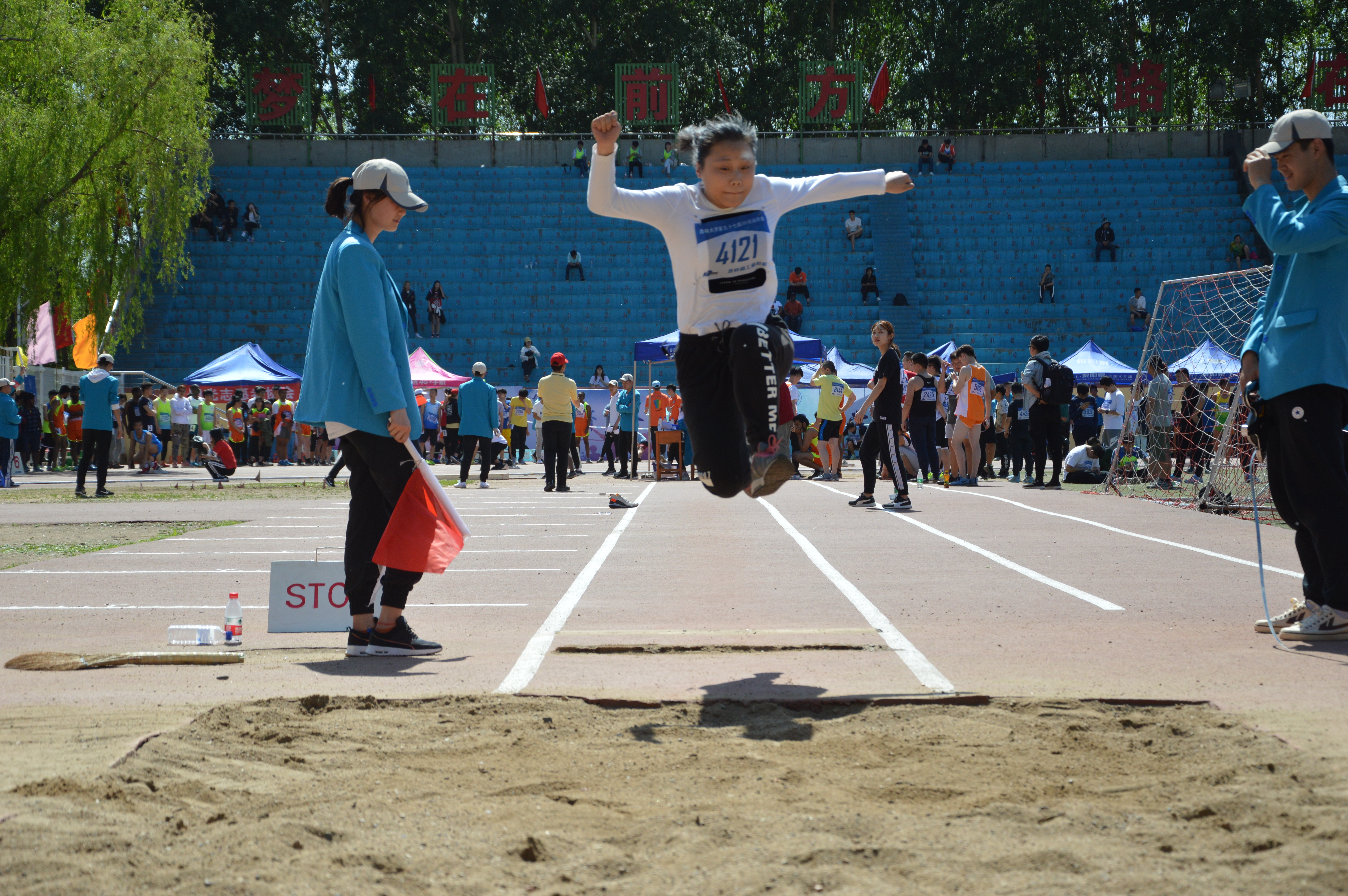 首先是温雅雯同学上场,当裁判员挥旗示意后,温雅雯逐步向前冲刺,一个高跳,落入沙坑中,可惜的是,裁判判她犯规,还剩下两次机会。经过一轮,温雅雯开始她的第二次跳远,她以3米78的成绩名列前茅。紧接着,她突破自己,以3米98的成绩完成第三次跳远。万思雨同学发挥的也非常稳定,裁判旗一落,她就快速的向前冲刺,同样一个高跳,落入沙坑,取得3米66的成绩。在后两次的跳远中,万思雨的成绩均在3米5以上。最终,这两位同学都进入了决赛。决赛中,每人也都有三次机会。但遗憾的是,万思雨第一次因没有调整好步伐,没能起跳,在后两次中因为同样的原因,成绩不太理想。轮到温雅雯时,她不断突破自己,在第三次起跳中以4米14的优秀成绩取得了跳远比赛的第一名。