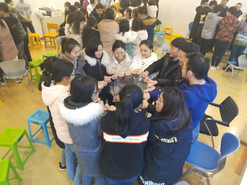 下午1点,同学们陆续到达教室并通过报数的方式分组坐好。第一个环节,通过让大家互相记住昵称并模仿对方设计的动作,来消解彼此间的陌生,现场气氛迅速变得融洽起来。随后,第二个环节,要求大家双手握拳,将拇指露出,用自身左手攥住右手拇指,每个人再攥住相邻右侧的人的拇指,大家手牵手、肩并肩,共同围成一个完整的圆。通过这个简单的游戏,同学们体会到了集体完成一件任务时每个个体在其中的重要性,也感受到了团结的力量。