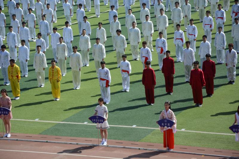 只听一声令下,同学们纷纷行抱拳礼。公卫学子们一袭白衣,系着红色的腰带,像军人一般昂首挺胸地站在操场上,成为了运动场上一道亮丽的风景线。伴随着雄壮的音乐响起,同学们整齐划一的动作如行云流水一般,展现在观众的眼前,一招一式尽显少年意气,一拳一腿满是青春芳华。炎炎烈日之下,滚烫的操场之上,他们毫不懈怠,只想将自己勤学苦练的成果做出最好的诠释。当收势的口令响起,同学们又迅速站好,像一棵棵笔直生长的大树。