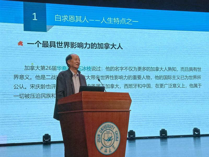 随后,马国庆副会长做了题为《白求恩——不曾远去的英雄》的主题演讲。以激昂的文字介绍了白求恩的生平事迹,从白求恩的思路历程出发,讲述了他是如何成为“一个高尚的人,一个纯粹的人,一个有道德的人,一个脱离了低级趣味的人,一个有益于人民的人”。演讲的最后,马国庆副会长号召新生们要紧随白求恩的脚步,发扬白求恩精神,成为一个有益于人民和社会的高尚的人。