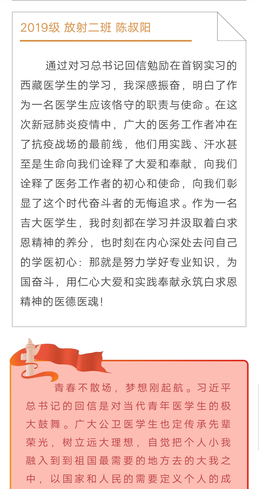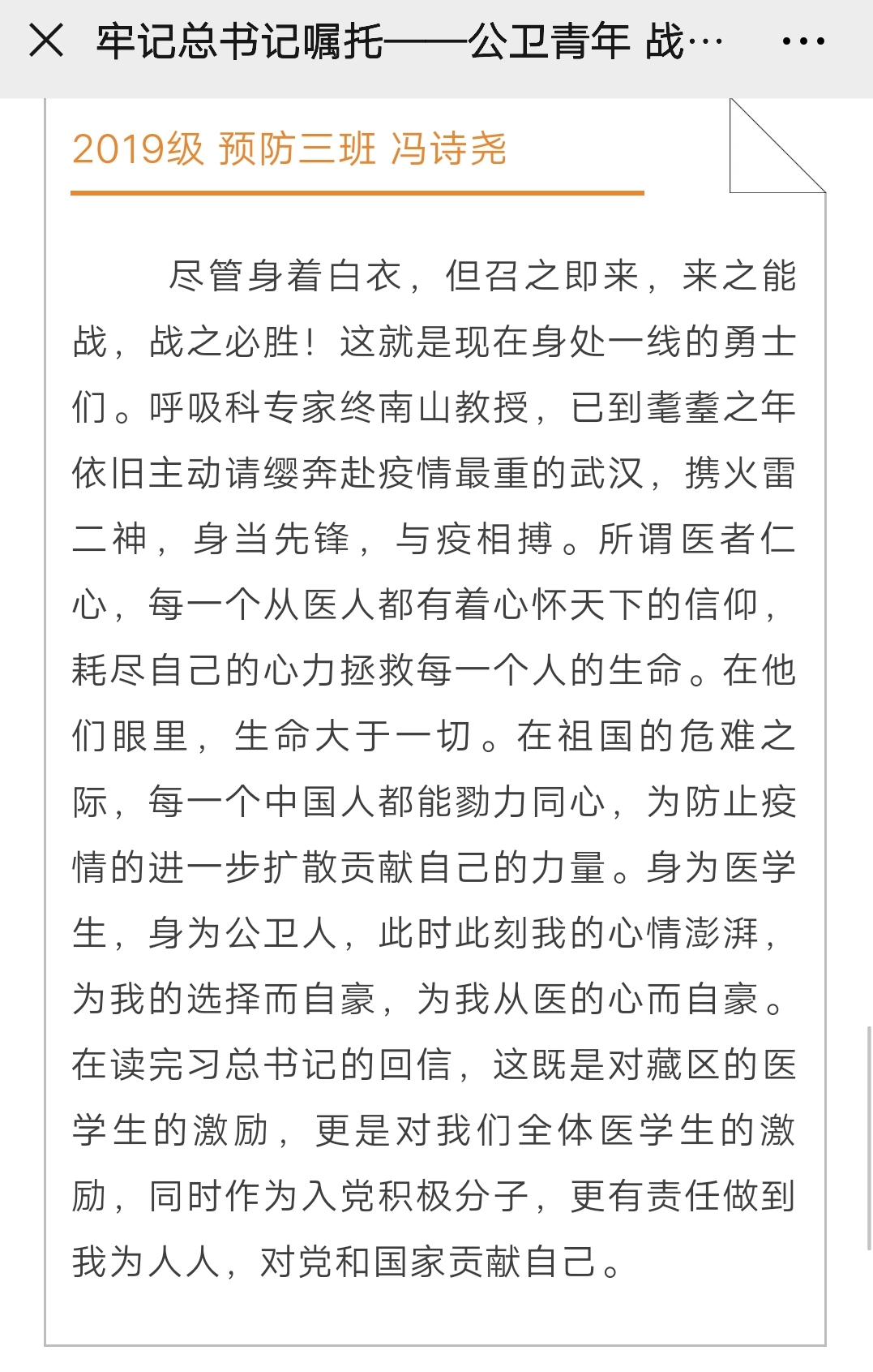 在这个特殊的时期,本次活动的开展让同学们认识到学习近平总书记回信精神,不仅要学深悟透,更要及时行动,实践所学知识,造福社会。在这场疫情防控阻击战中,无数的医务工作者用他们的行为为全体医员工做出了表率,树立起精神的丰碑。作为一名医员工,传承白求恩精神,牢记责任使命,学好专业知识,坚定崇高思想,这是公卫学子从疫情中学到的最真切的体悟。