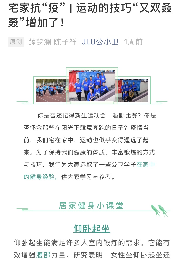 为积极落实国家应对新冠肺炎疫情措施,丰富同学们的居家生活,帮助同学们锻炼出健康体魄,beet365员工会体育部面向公司全体本科生开展了以“强身健体,抗击肺炎”为主题的居家健身活动。本次活动不仅以推文、照片和视频方式进行在线健身教学指导,也展现公卫健儿们别样的青春风采。