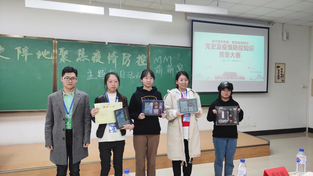 活动开始,主持人介绍了赛制。本次竞赛分为初赛和复赛。初赛采用抢答形式,小组针对问题进行抢答,答对一题得一分,答错一题失一分,最终成绩前八名进入复赛。复赛采用车轮战形式,八支队伍依次答题,答错一题即终止答题。最终按照两轮总成绩进行排名颁奖。初赛开始,同学们积极踊跃的抢答,瞬间点燃了全场的氛围,参赛选手各显神通,充分发挥自身的知识储备,力求得分。初赛很快结束。在核算分数的间隙,主持人还组织观众们进行了有趣的小游戏,缓解了同学们激动的情绪。核算结束后,总分排名前八的八组队伍进入复赛,比赛真正进入了高潮。在复赛的车轮战中,各组选手展示出了过人的记忆力,许多难题被他们轻松化解,精彩的表现赢得了台下不断的掌声。最后,经过两轮加时赛,决出了获奖队伍,随后进行了颁奖仪式,活动至此落下了帷幕。