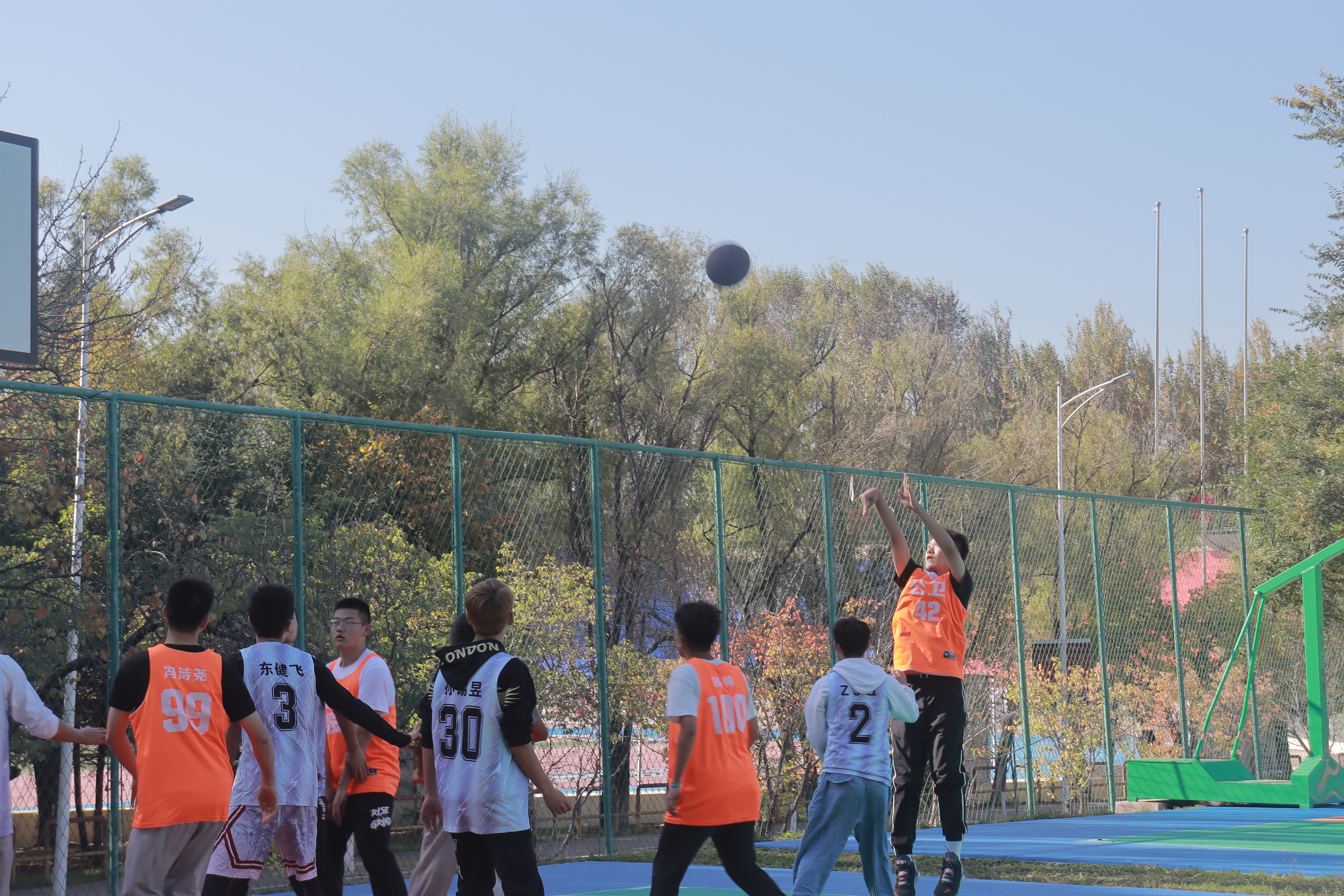比赛于上午九点正式拉开帷幕。本次比赛共分为四个小节,每小节12分钟。秋风带来了一丝丝寒冷,可同学们的热情丝毫未减。随着哨声的响起,双方队员你争我夺,你攻我守,赢来了同学们的阵阵欢呼,很快,比赛就到了白热化的阶段。2021级新生靠着初生牛犊不怕虎的劲大胆进攻,抢断、传球、运球、投球,干净利落的动作获得了现场同学们的掌声。可高年级的同学凭借着默契的配合、出色的防守打乱了21级同学的节奏,接连得分。赛场上空,球划过的一道道优美弧线展现的是当代老员工的风采以及青春活力!终场哨声响起,比赛以38:92的比分画上了句号,高年级联队获得了胜利。比赛结束后,新生和老生进行了亲切的交流,最后在场的球员和观众一起合影留恋。