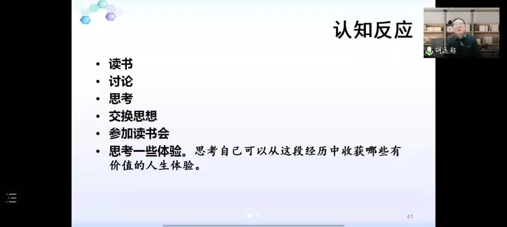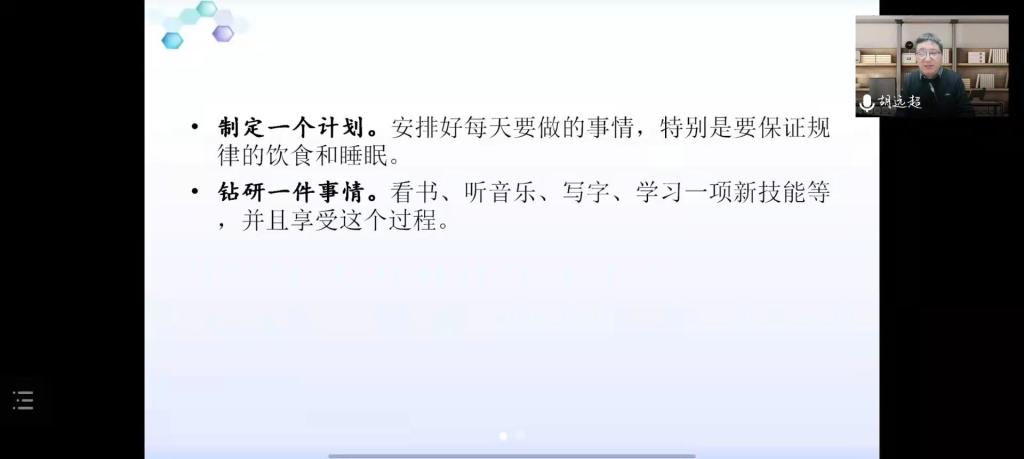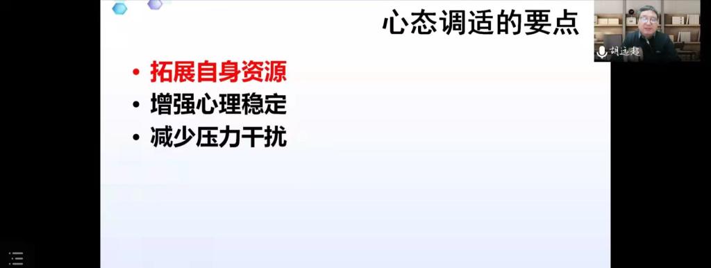 讲座伊始,胡老师阐述了疫情当下同学们的现实处境,并从生活、学习、情绪、人际关系等多方面分析了同学们的压力来源,以“感觉剥夺实验”类比当前疫情形势,指出师生们需要从生活学习和来自外部的刺激中进行自我调节,并给出了调适心态的三个要点:一是要拓展自身资源。胡老师提出,“生活本身是最好的心理咨询师。”把握住来自生活方方面面的资源系统对于缓解压力,调节情绪具有重要意义。二是增强心理稳定。他鼓励同学们采用意义换框法进行自我调节以稳定心理。三是减少压力干扰。我们可以从生理反应、认知反应、情绪状态和行为表现四个方面减少压力对心理状态的影响。讲座的最后,胡老师与各位师生进行线上交流,到此讲座圆满结束。