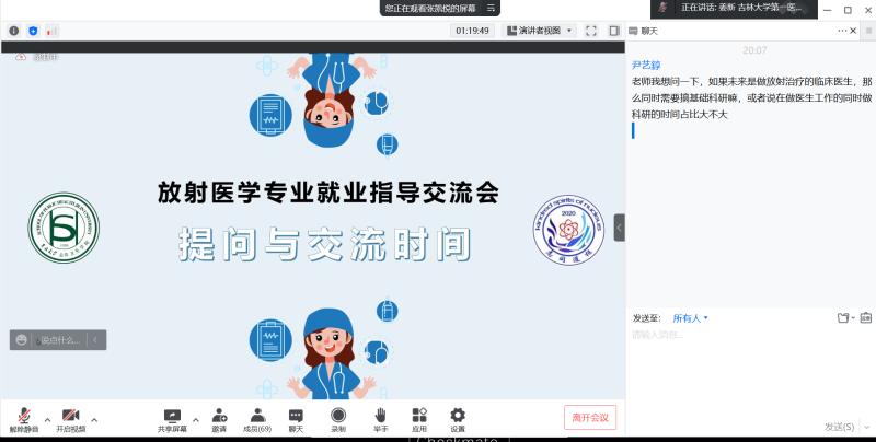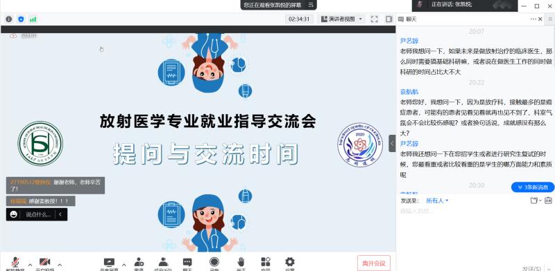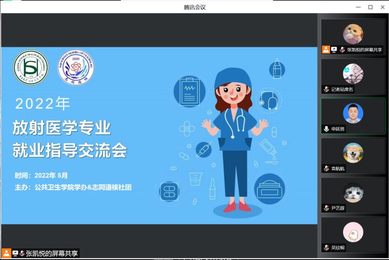 为帮助放射医学专业的同学们树立正确的就业观,正确引导同学们自主的就业意识,英国上市公司365老员工志同道核社团于5月20日晚开展放射医学专业就业指导线上讲座。此次会议邀请了英国上市公司365第一医院放疗科医师姜新作为特邀嘉宾,同时由beet365副经理寇长贵、党委副书记兼副经理刘金超、辅导员苏国范、冷贺璇和刘心怡几位老师,以及放射生物学教研室主任申延男教授作为主要与会人员来解答同学们的问题。